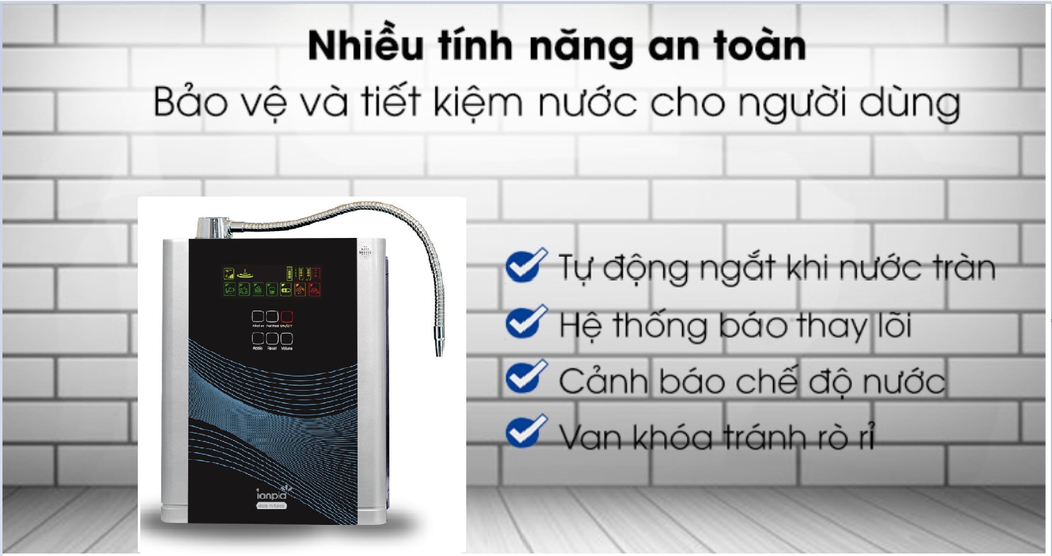 Máy tự động ngắt nước sau 10 phút chảy liên tục, có hệ thống thay lõi thông minh hiển thị trên màn hình, van khóa tránh rò rỉ nước ra ngoài,… Những tính năng tiện dụng, hữu ích và an toàn cho mọi thành viên trong gia đình khi sử dụng.